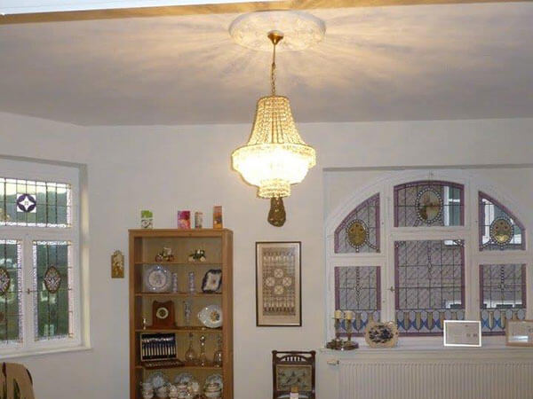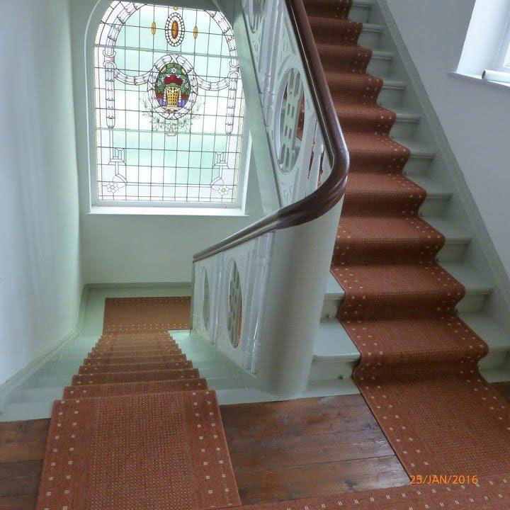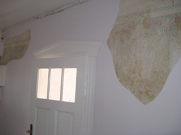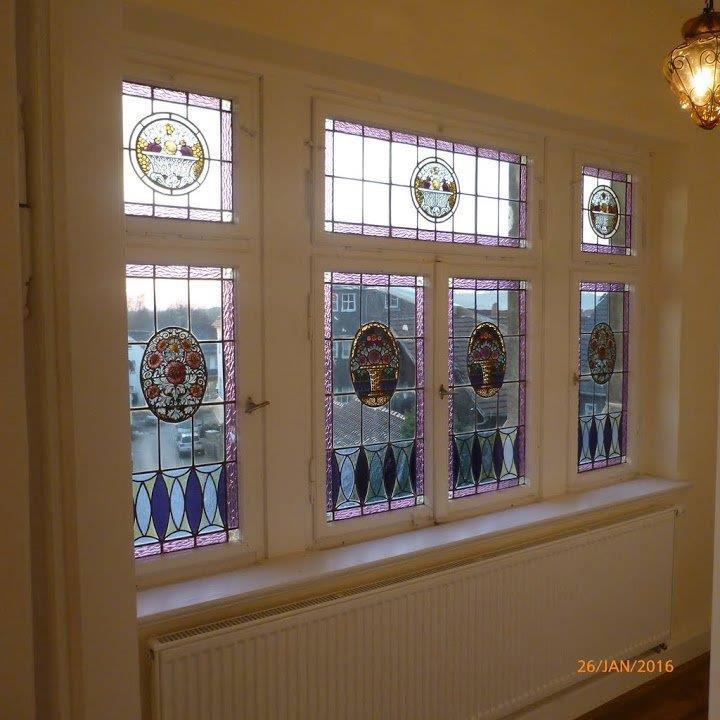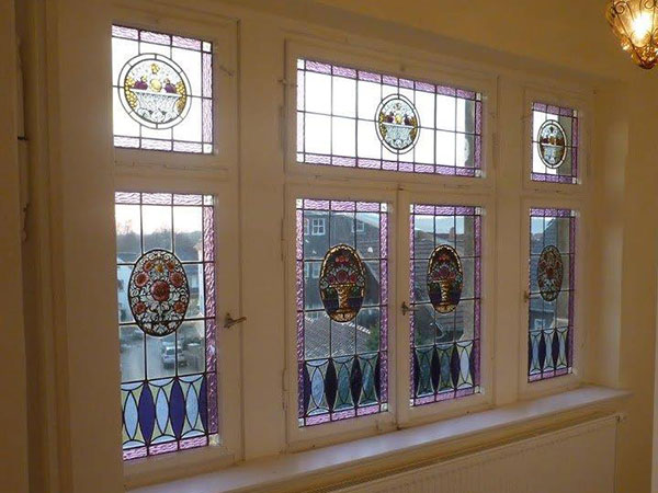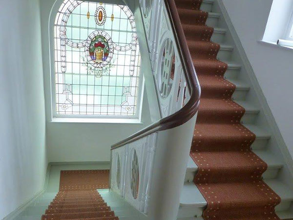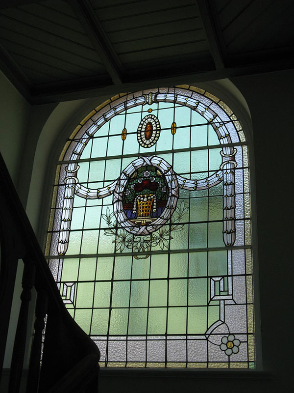 Above the door a magnificent stained glass Window 1.5 m wide x 2.5 m high provides the light into the four storey high stairwell. The design of the window again depicts the owners business of wicker baskets.