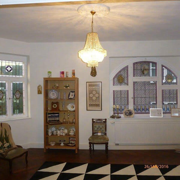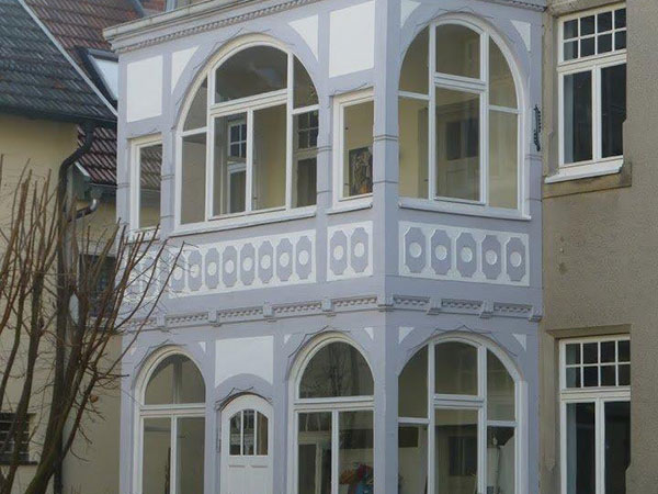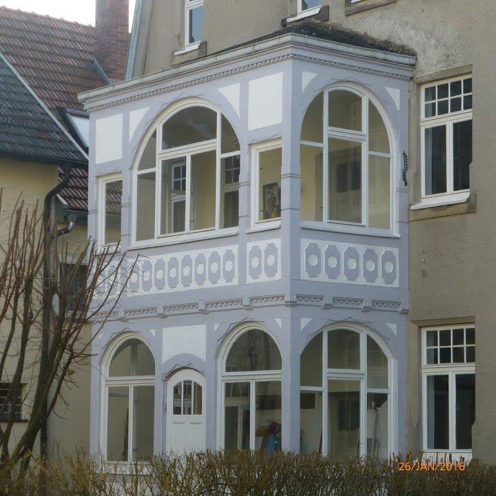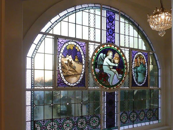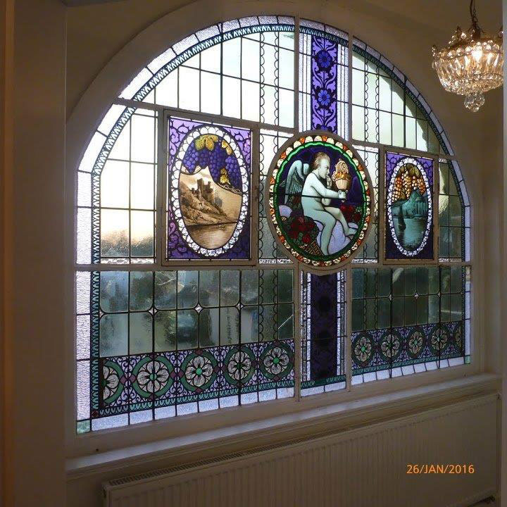 A small study (Erker) with a magnificent original Stained glass semi-circular window 2m wide x 1.5m high, depicting a cherub in the middle section enjoying the fruits of life from a wicker basket (owner's factory manufactured products made out of wicker ). The left panel shows the view of River Rhine and the famous Rheinstein castle whereas the right panel depicts the scene of grapes and wine with a pavillion in the back ground. The window adorns the frontage of the Villa overlooking Dr. Knauer Strasse to the front.