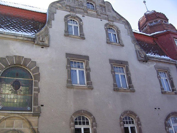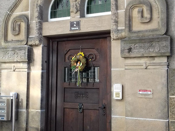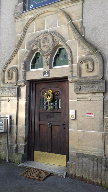 To the West side of the house is the main entrance door and above the door is the date of construction and the initials of the Wicker factory owner Georg Loesch (G.L. 1913) are carved.