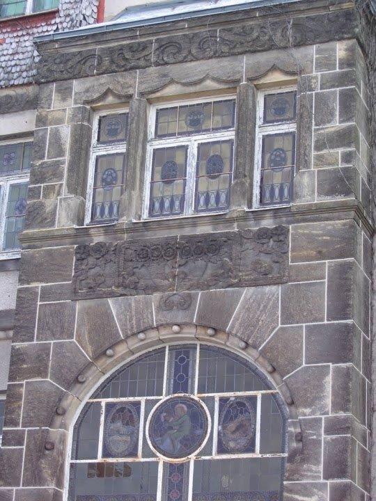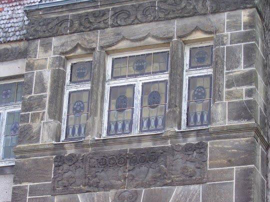 The Sandstone ( sandstein) used in the construction of the Villa is of grade 1 (the highest quality ) and the stonemasons have carved bas-relief figures on the sandstone to the south and west facade of the building in the form of cornucopia and faces to ward off evil spirits away from the house.