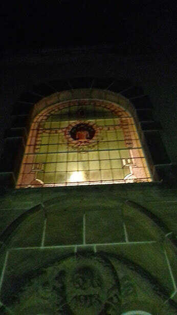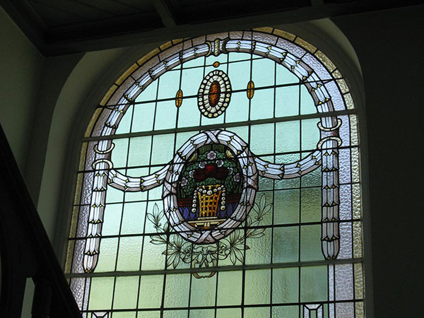The southern front facade facing the main road has as the main feature the semi-circular stained glass window and above lies a bas relief cornucopia and flowers carved out of sandstone. Similar bas relief carving of floral design also decorates the top of the second floor windows.