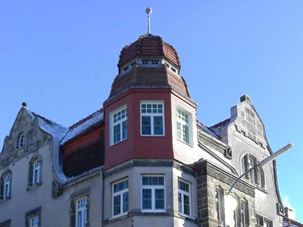 The western facade facing Schutzen street has the two faces carved on both sides of the middle gable which are supposed to protect the house from evil spirits.